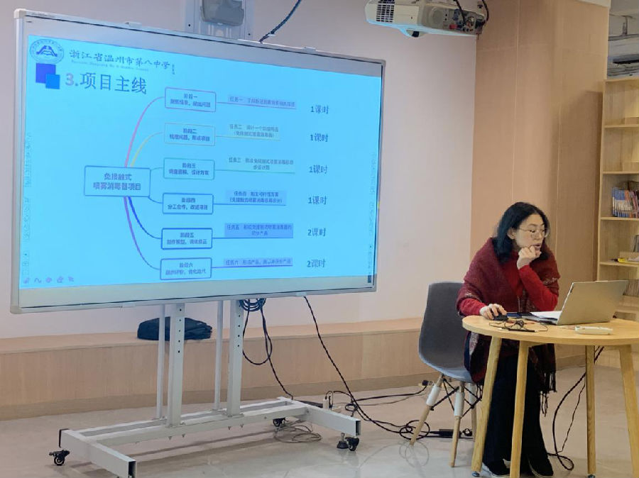 温州市第八中学的吴芳芳老师做了《免接触式喷雾消毒器》的steam案例分享。项目设计的思路是:关注生活热点,设计驱动问题;以学科为中心,跨学科融合等。项目的背景是新冠病毒防疫的大社会背景,针对八年级学生,并详细介绍了项目学习的六个阶段和六个任务,如何聚焦核心问题,设计学生活动,展示学生作品,最终讲产品制作确定在设计并制作消毒器上。然后,从工程设计的调查、设计、创造、评估四个环节制作,设计和创造的目标性、复杂性和多样性。最后从过程和结果两方面开展项目评价,展示众多的项目评价表,分享了学生通过评价改进作品的过程。允许有多个设计和解决问题的途径,对失败的作品重新研制是学习的一个必要部分,激发学生的兴趣有很大的帮助。
