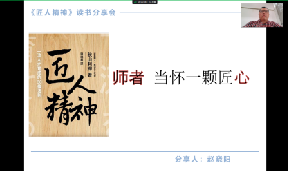 分享会由工作室主持人赵晓阳名师主持,赵老师还和大家分享了阅读秋山利辉《匠人精神》的感想做了题为《师者,当怀一颗匠心》的分享,他详细地介绍了《匠人精神》中的 “匠人须知30条”,以及书中的精髓——育人,并结合具体的事例进行了解读。同时,在《匠人精神》的启发下,开发并设计了“教师必须遵守的30条”和“学生必须遵守的30条”,达到了读书指向未来的特性。