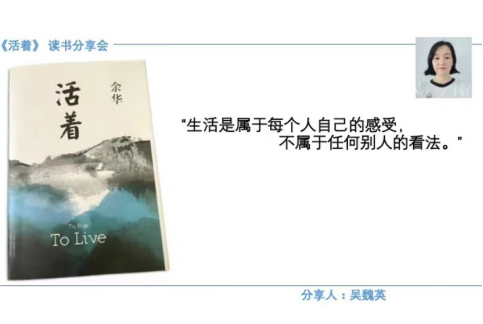 吴魏英和大家分享了《活着》,吴老师带领同学们回顾了《活着》一书的故事梗概,作者余华老师在书中描绘了主人公福贵曲折起伏的悲惨一生。吴老师引用书中的原句引领老师们体悟作品的精神内核,即在悲惨的人生中忍受现实所给予的苦难、无聊、平庸,并在其中懂得“活着”的生活真谛。