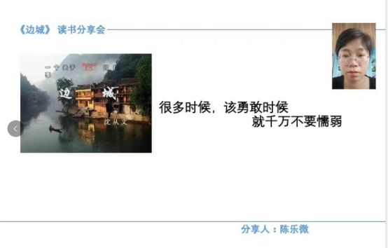 陈乐微老师带领我们品味《人性如诗 亦喜亦悲》。边城的人民是“一群未被近代文明污染”的善良人,他们保持着昔日宁静和谐的生活环境与纯朴勤俭的古老民风。通过字里行间,我们能感受到沈先生努力建构了一个充满自然人性的世外桃源,创造的人物闪烁着人性中率真美丽、虔诚的一面,边城的人民就是人性美的代表。