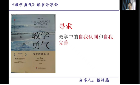 蔡林燕老师分享了《教学的勇气》一书,她认为作为教师要保持心灵的完整,让教学成为自己生活乐趣的一部分。学生迫切需要沐浴教师心灵之阳光,教师也迫切需要透过学生的生命完满自我,只有教师能和自己的心灵对话,才有可能将心灵呈现在他的学生面前,让知识变得绿意盎然,真正的教学才能发生。