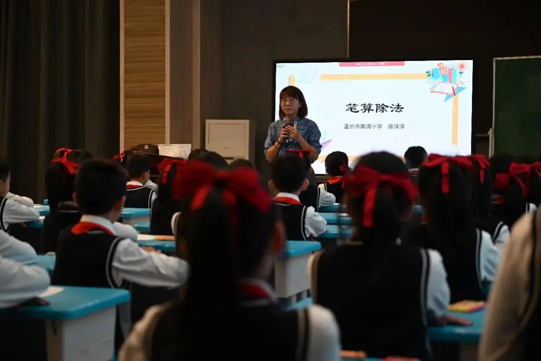 第一节是由温州市南浦小学徐淳淳老师带来的《笔算除法》。徐老师先通过分小棒的活动,展示并对比2种分法,着重理解先分十位再分个位的优势,让学生经历计数单位细分的过程。再通过列竖式,抓住分小棒的每一步,学生对于18个一是怎么分的有了更深的理解。徐老师紧紧抓住计数单位,并和二年级除法沟通联系完善知识建构,激发学生深度思考。