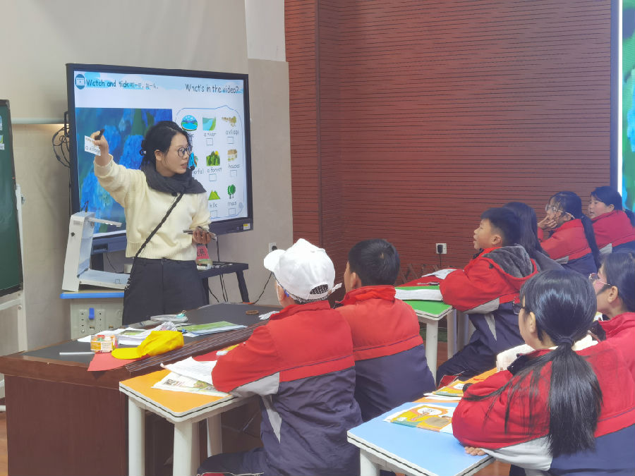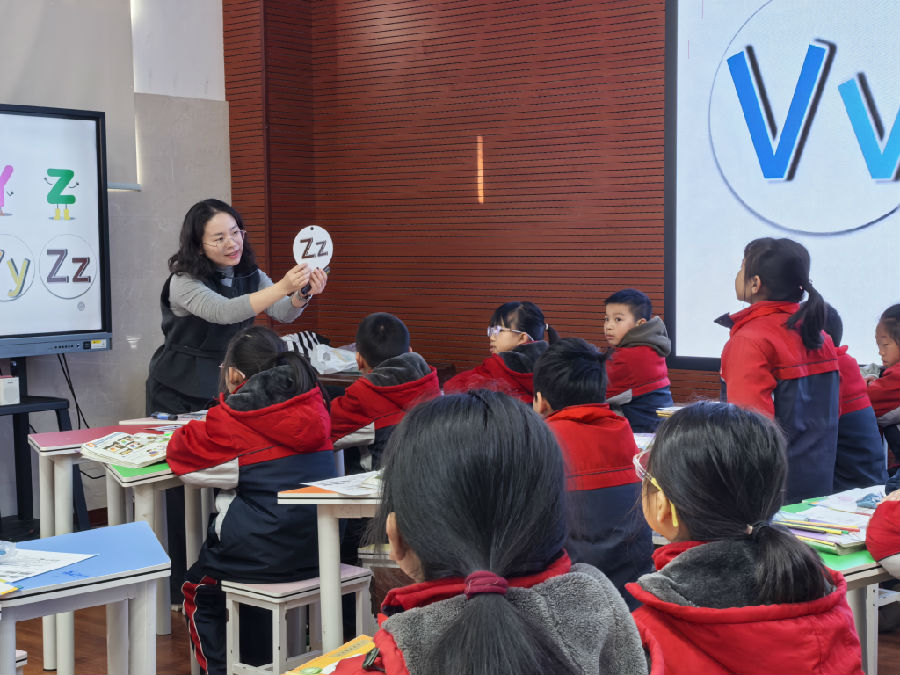 紧接着,来自龙湾区沙城第三小学的施红碧老师带来PEP 1 Unit 6 A Letters and sounds的课例展示。语音课宛如一场奇妙的发音探索之旅。施老师运用色彩鲜艳的字母卡片、灵动活泼的动画视频,把抽象的字母发音规则具象化。施老师有效利用教材资源,打通单元脉络,在具体的语境中精心设计递进式活动,引领学生切实感知并掌握字母V、W、X、Y、Z的字母本身发音以及它们在单词中的发音。从字母发音、书写的精准示范,再到单词拼读游戏的巧妙设计,学生们在有趣的英语课堂中感受Fun letters and numbers。