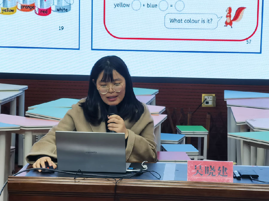 随后,来自泰顺县三魁镇中心小学的刘情程老师带来《PEP 1 Unit 5 B Start to read》的课例展示。刘老师以活动单为抓手,以问题链“What colours do you see?” “What colour is it?” “What colours can talk?” “What can the colour say?” “How do colours help us?” 推进课堂教学活动,开展语篇的阅读及意义的探寻,引导学生运用所学语言描述事物的不同颜色,发现大自然的神奇色彩和颜色的不同功能,领会颜色的重要性,促进学生真实学习的发生及思维品质的发展。