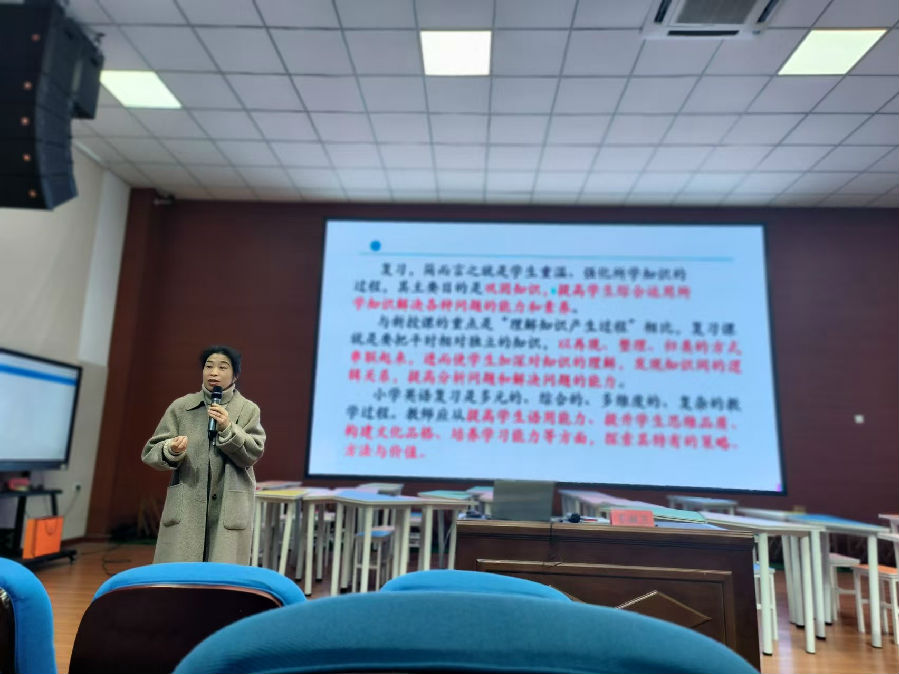 最后,泰顺县教师发展中心的毛淑芝老师带来了专题讲座《情景命题:小学英语单元复习的快乐载体》。毛老师深入剖析当下单元复习的困境,点明情景缺失导致复习枯燥低效的症结。随后,毛老师分享一系列实操性强的复习策略,指出小学英语复习是多元的、综合的、多维度的、复杂的教学过程。教师应从提高学生语用能力、提高学生思维品质、构建文化品格、培养学习能力等方面,探索其特有的策略、方法与价值。丰富的案例配合深入浅出的讲解,让在座的老师们明晰如何让复习课告别单调,变身趣味知识盛宴,为期末及日常单元复习注入新的活力。