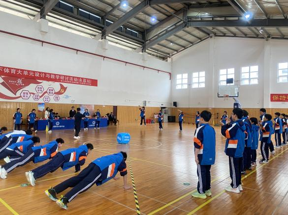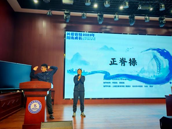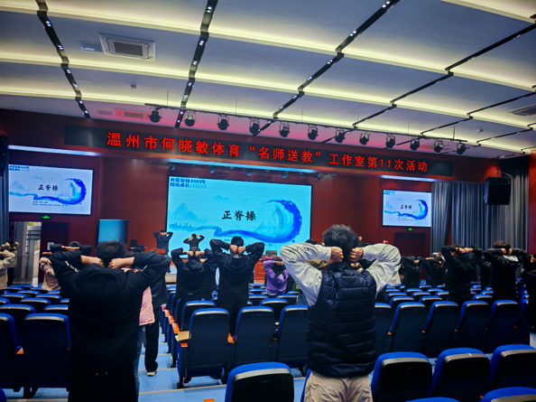 莫豪庆名师工作室的成员,杭州市东城第二实验学校的李茹钰老师和杭州师范大学东城中学的蔡聪聪老师带来了正脊操的教学,与会教师积极参与学练(该正脊操2023年3月在全省中小学率先推广,中央电视台“新闻1+1”报道).