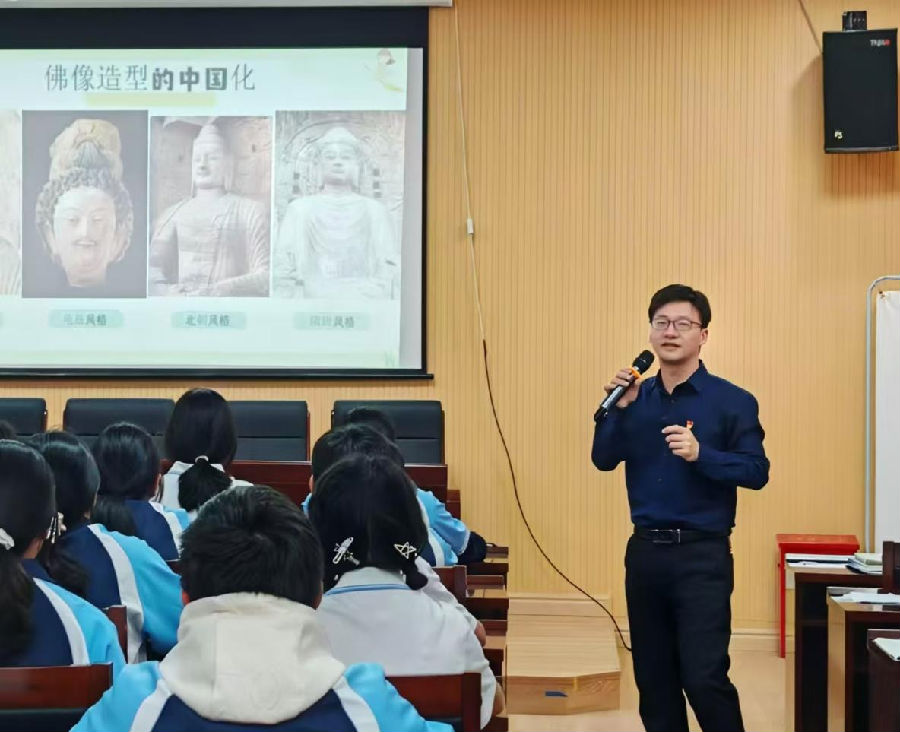 平阳县海西镇宋埠中学卢立伟副校长执教七下道德与法治《影响深远的人文精神》。整节课以“感悟中华人文精神”为主线,设置揭秘文物、诗文传承、中式美学、生活理念等课堂任务,几大板块层层推进,引导学生感悟人文精神影响之深远。在“诗文传承”板块,卢校长带领学生通过收集各类诗词并进行分类的活动,让学生感受到古人的人文精神。课堂融入《千里江山图》、舞剧《只此青绿》、图片“中和殿、太和殿”等多种素材,拉近抽象概念与学生生活的距离。