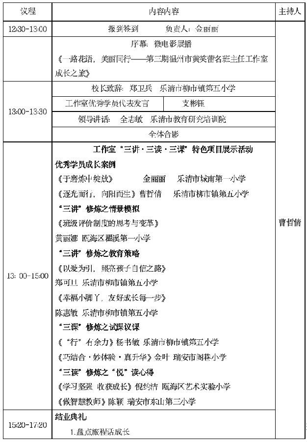 为了贯彻《教育部关于进一步加强中小学班主任工作的意见》文件精神,为发挥名师的示范辐射作用,加快班主任队伍建设,提高班主任专业素养,现决定举行第三期温州市黄笑蕾名班主任工作室第27次集训“三读·三讲·三课”项目研修成果展示活动(结业典礼)暨乐清市柳市镇第五小学教育集团班主任研修活动。现将有关事项通知如下: